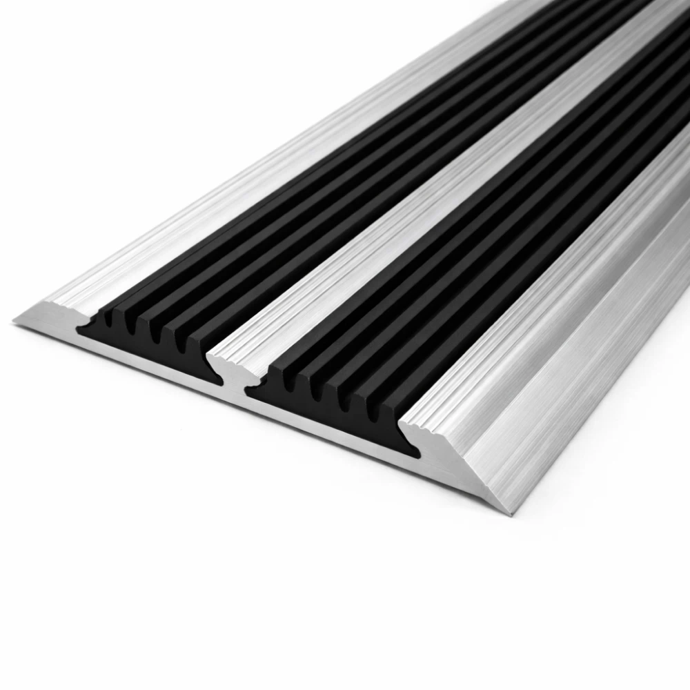 Эта алюминиевая планка с размерами 70*5мм, длиной 2м, черного цвета, обладает высокой долговечностью и прочностью, что подтверждается её температурным режимом эксплуатации от -40°С до +60ºС. В ней предусмотрены две вставки против скольжения, которые могут быть заменены без разбора ступени. Она предназначена для установки на ступени лестницы в качестве противоскользящего профиля безопасности и декоративной отделки. Установка профиля на поверхность ступеней осуществляется с помощью винтов и дюбелей. Эластичная накладка из термоэластопласта надёжно укладывается в пазы порожка.