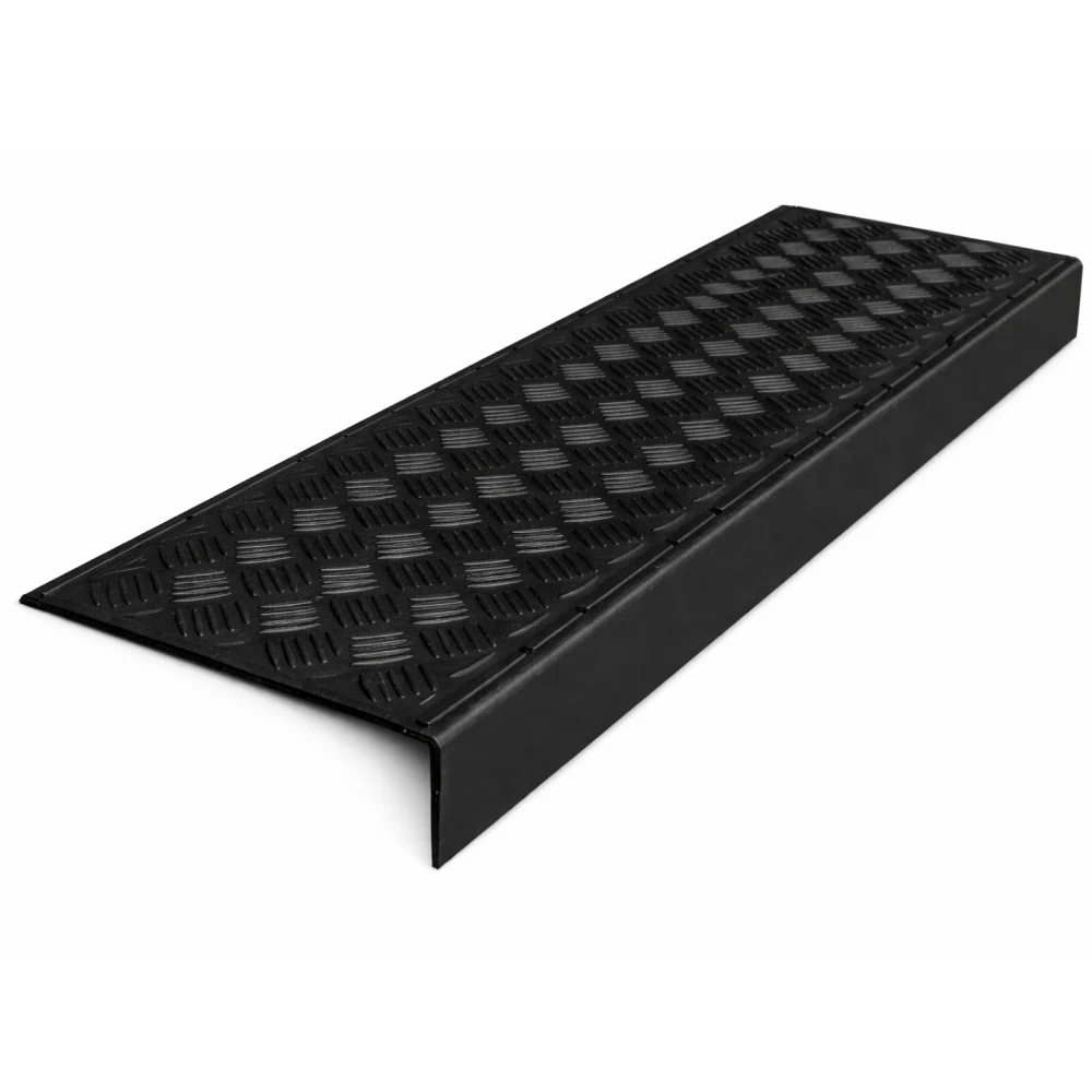 Резиновая накладка размером 750*305*71 мм и выполненная в черном цвете, предотвращает падение на гранитных, мраморных и других видах ступеней. На ее поверхности имеется специальный узор из неровностей, предотвращающий скольжение. Такая проступь используется в общественных и частных домах, полностью покрывая ступень, даря эффект полного покрытия лестницы и защищая лестничное полотно от повреждений.