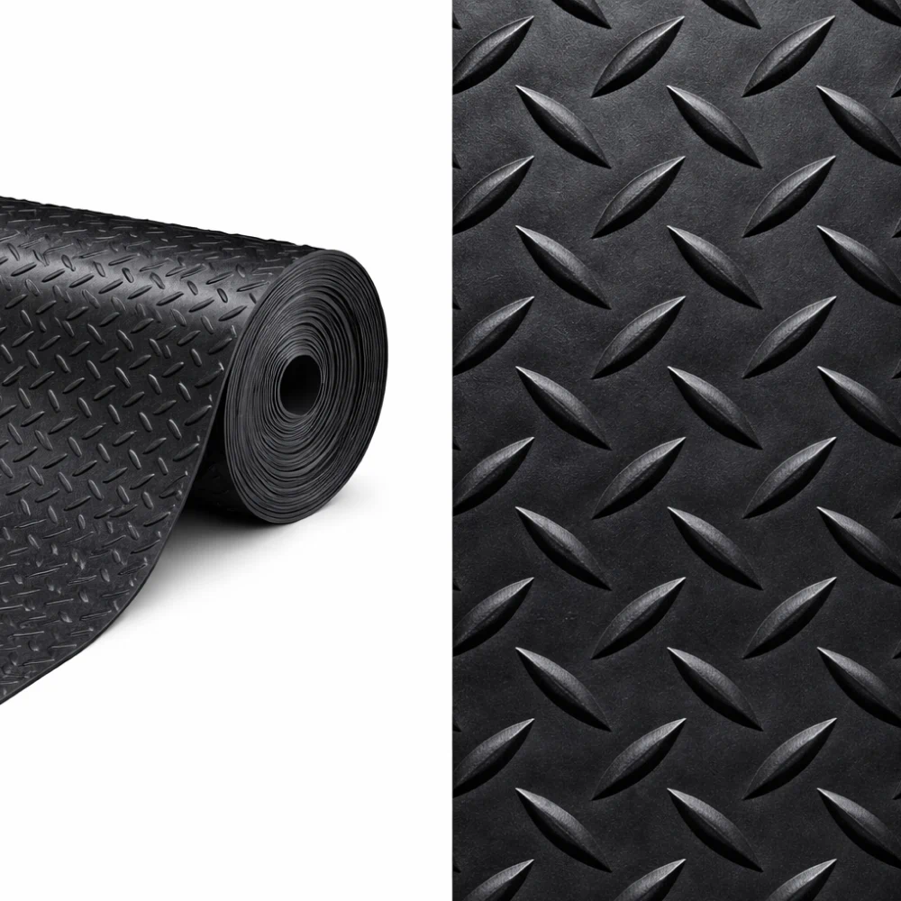 На изготовление резиновых дорожек данного типа используется прочная шумопоглощающая резина рулонного типа с толщиной до 4 мм. Она обладает достаточной прочностью для большого точечного воздействия, а также способна хорошо переносить температурные скачки в диапазоне от -30 до +80 градусов. Это покрытие используется для укладки входных групп в здания, лестниц и полов помещений и имеет черный цвет.